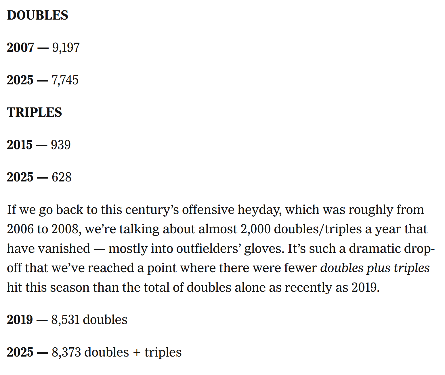 There was an article run in the Athletic this week discussing the drop in doubles and triples, ending with a proposal to limit where outfielders could play. It had its points, but it left me with more questions than answers. And the changing baselines certainly didn’t help.