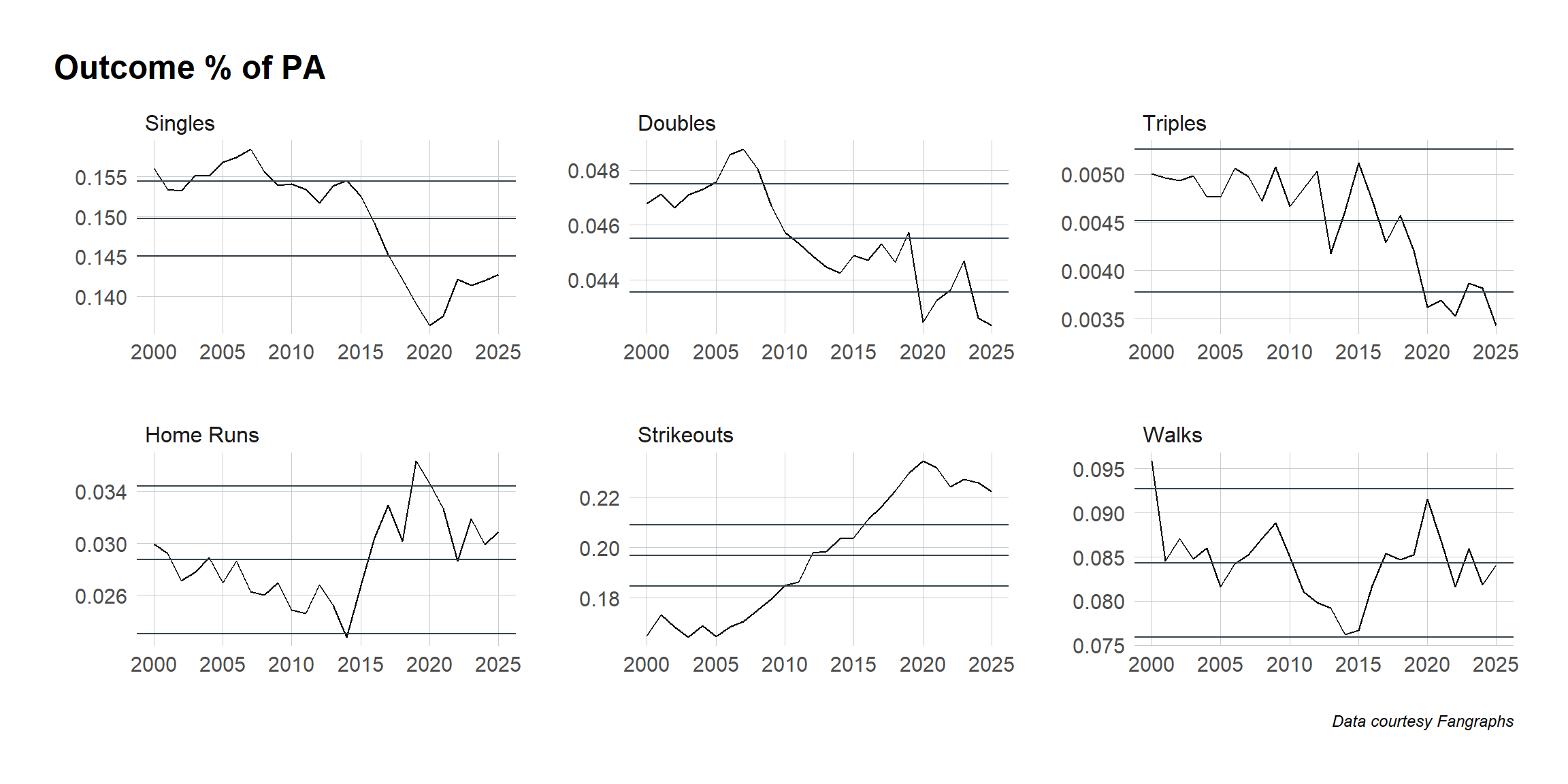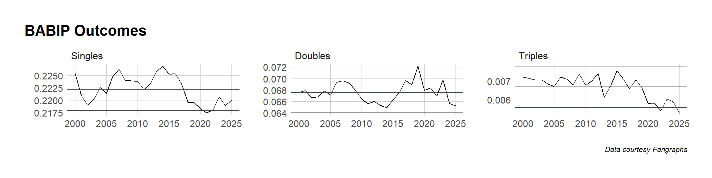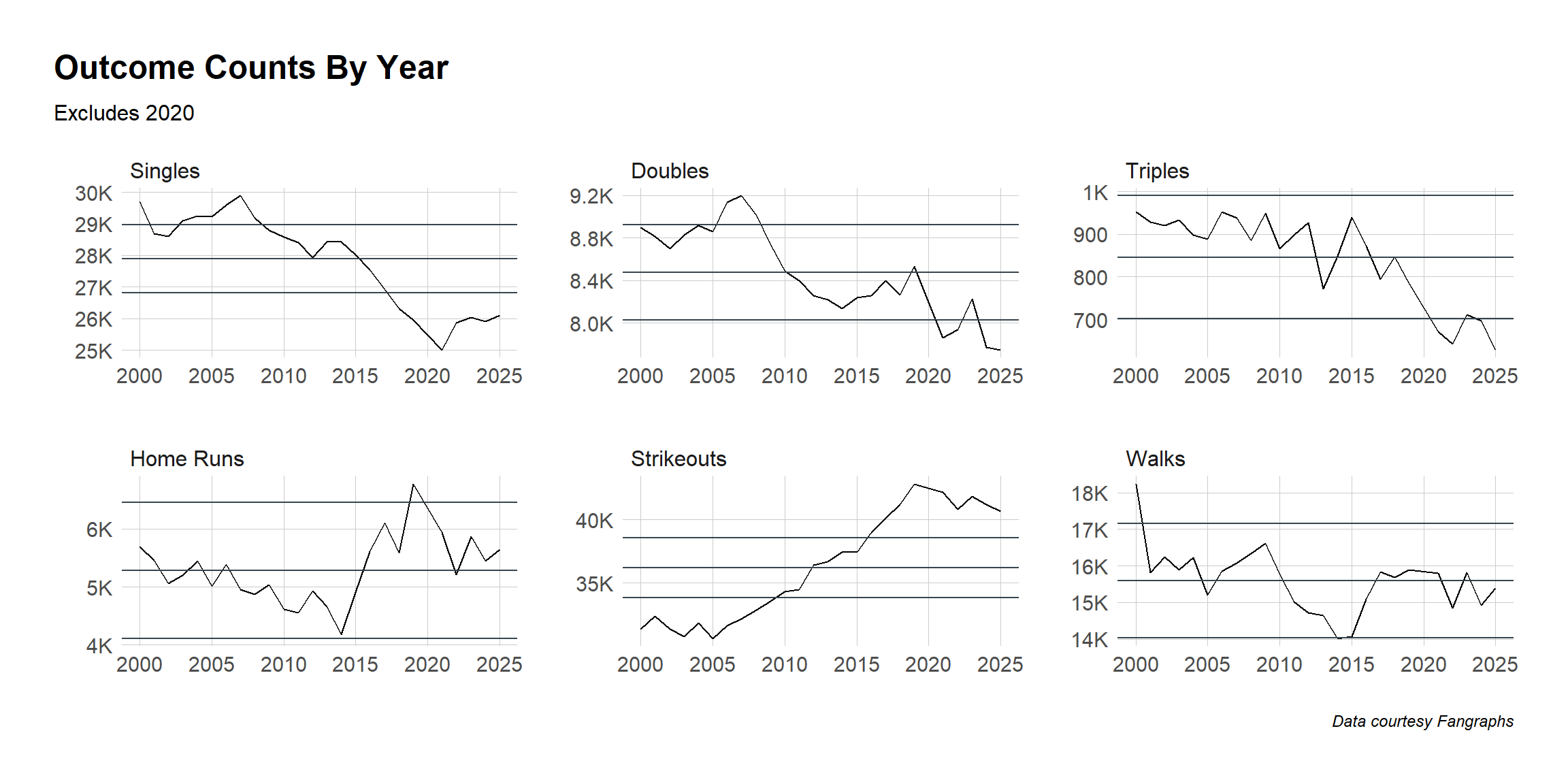 So, the math suggests that the difference in triples is largely due to the decrease in triples on balls in play, which we can attribute to improved defense. Doubles are partially driven by improved defense, but since only 123 of the 497 “missing” doubles are due to rate change, we can chalk this up more to a drop in balls in play*. (In fact - if we had 124K BIP in 2025 at the 6.5% double rate, we’d have 8,083 doubles, not far from the 2015 mark.) Singles have also dropped primarily due to the decrease in balls in play.