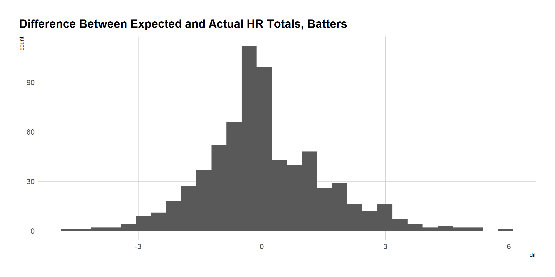 I used 2025 play by play data from Retrosheet. I also decided to add park to the random effects model, since some parks (i.e. Wrigley) play more as home run parks than others. We’ll run the model, then predict for each plate appearance the probability of a home run. We’ll then sum up those probabilities and compare to actuals, first for pitchers and then for batters, and compare to actual. If you’re thinking “this sounds a lot like Expected Goals*”, well, the premise very much is. A better model would account for pitch type, wind speed, etc., but this fairly simple approach should yield some interesting results.