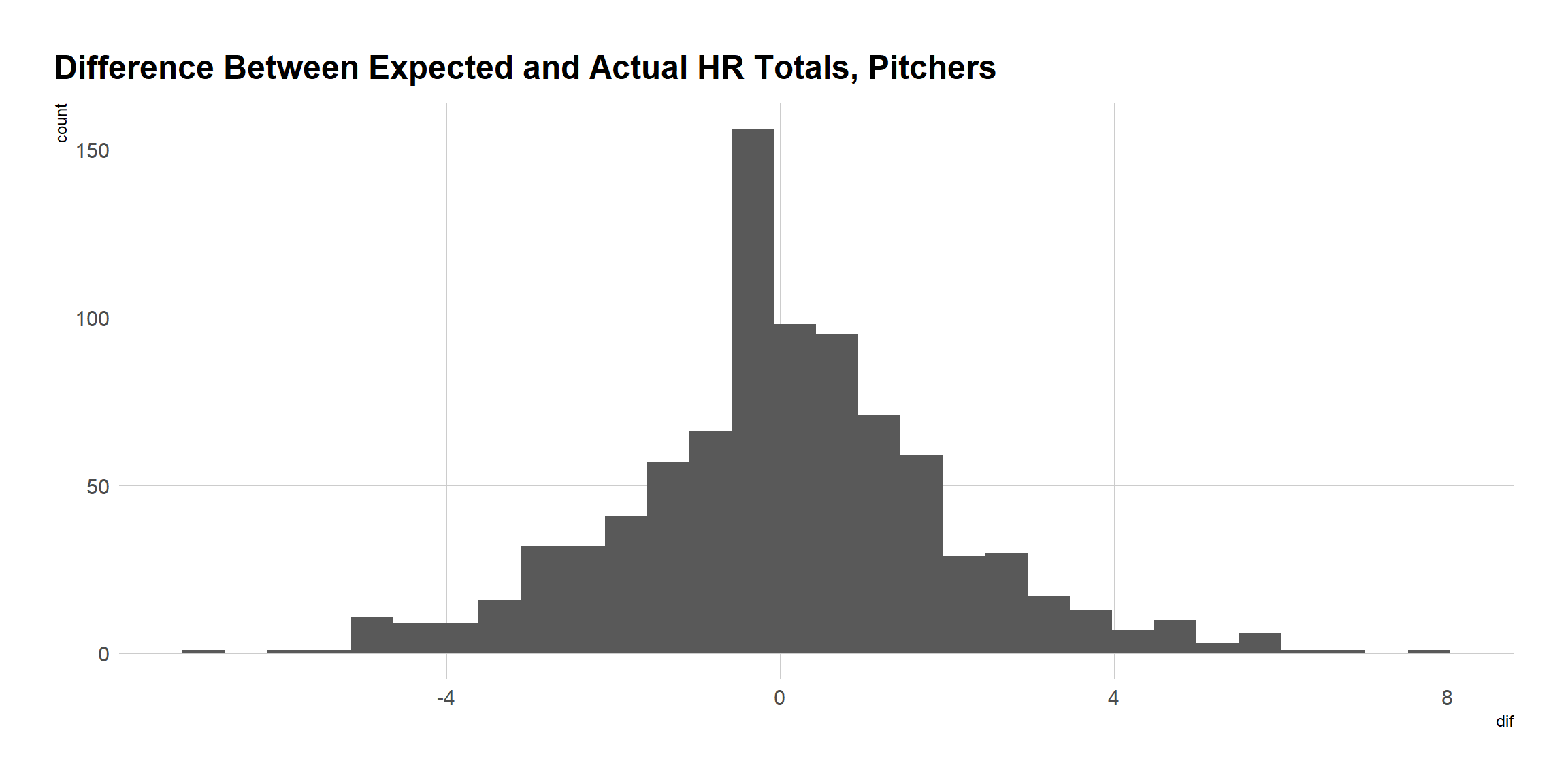 This suggests that Shota Imanaga - who has to pitch at Wrigley a lot - gave up 8 more home runs than we would have expected. Which seems relevant, but his 34 HR also fall within the range of the prediction interval of 12.8 and 52.4. This is a pretty wide range, but that’s common for pitchers. The difference of 8 HR is pretty extreme, since pitchers are within -5 and 5 in most cases.