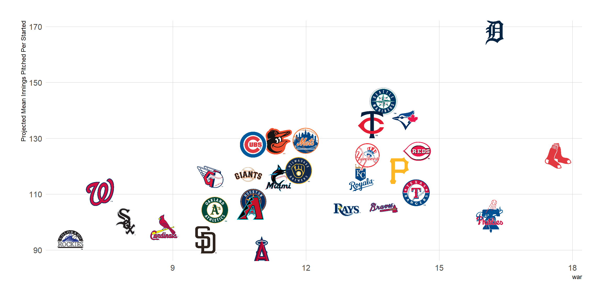 What’s interesting here is that, despite having the second-highest projected WAR in MLB, the Tigers are only projected to throw 841 innings, the lowest in the game. The depth charts only have 146 games slotted, so they’re not fully taking depth into account. The ~6 innings per game average is concerning, though, since their bullpen projects in the bottom half. Bullpens are hard to project, so we can hope that they’re better here.
